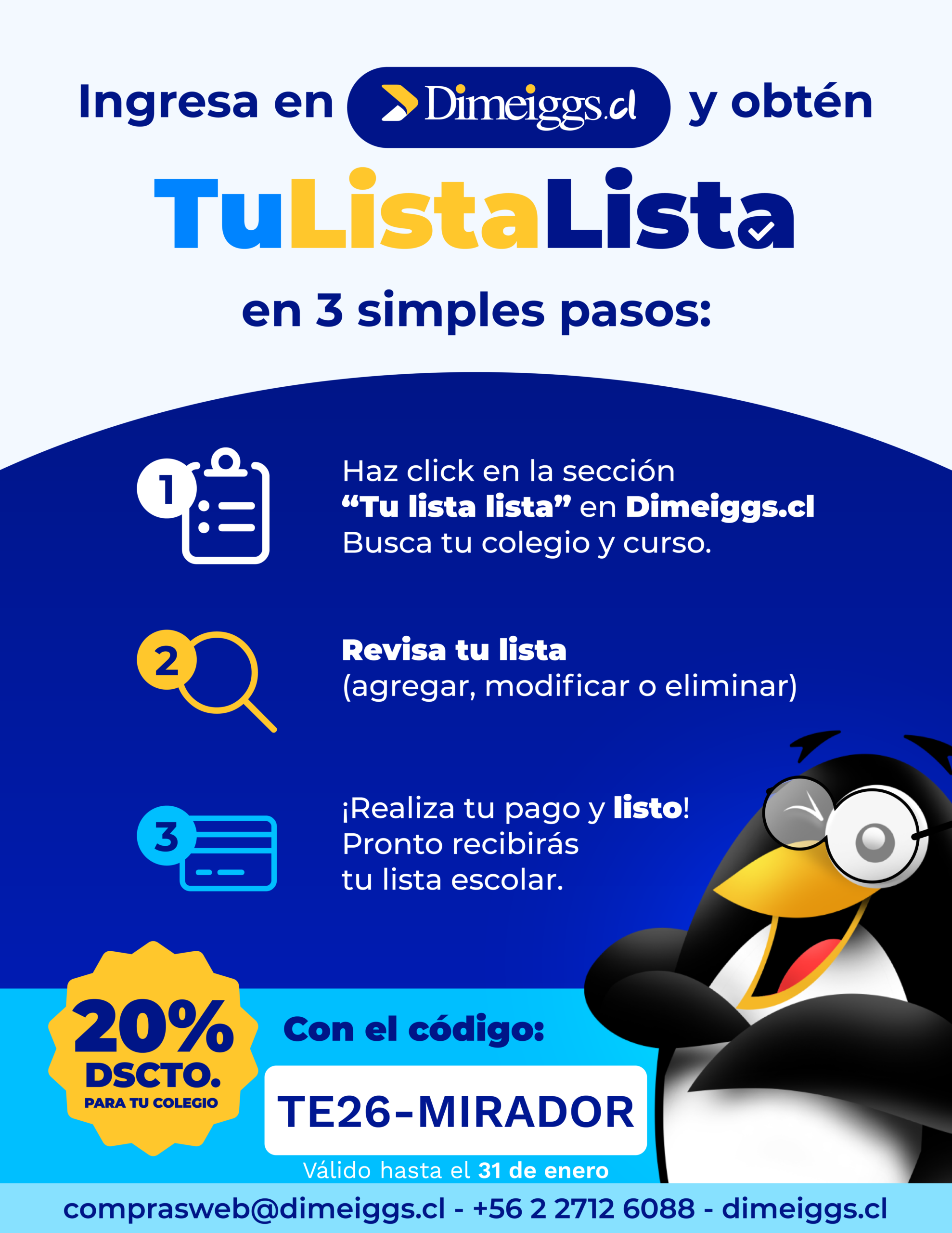 Es importante señalar que las familias tienen la libertad de comprar los útiles en el lugar que les parezca más adecuado. Si optan por compras online en la tienda Dimeiggs (que ya tienen las listas), las despachan y tienen 20% descuento. Les dejamos el cupón de descuento que ellos ofrecen.